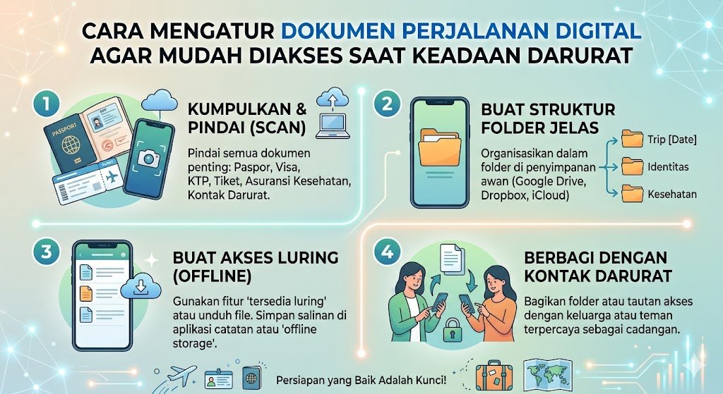 Keamanan data digital adalah prioritas utama mengingat dokumen perjalanan berisi informasi sensitif. Gunakan fitur pengunci aplikasi atau folder dengan biometrik seperti sidik jari atau pengenalan wajah. Selain menyimpan untuk diri sendiri, sangat disarankan untuk membagikan akses folder dokumen tersebut kepada satu atau dua orang terpercaya yang tidak ikut dalam perjalanan. Jika terjadi sesuatu pada perangkat komunikasi Anda, orang rumah atau kerabat terdekat dapat dengan cepat mengirimkan kembali salinan dokumen tersebut melalui saluran komunikasi lain untuk membantu proses administrasi darurat di kantor kedutaan atau rumah sakit.