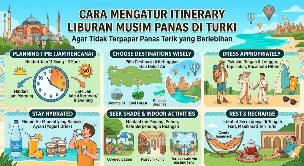 Melengkapi itinerary yang taktis, pastikan Anda selalu membawa botol minum yang dapat menjaga suhu air tetap dingin selama perjalanan. Mengonsumsi buah-buahan lokal Turki yang kaya air seperti semangka atau jeruk juga sangat membantu menjaga hidrasi tubuh. Dari sisi penampilan, pilihlah pakaian berbahan linen atau katun ringan dengan warna-warna cerah yang mampu memantulkan panas. Penggunaan topi lebar dan kacamata hitam bukan sekadar aksesori gaya, melainkan pelindung wajib saat Anda harus berpindah dari satu titik ke titik lainnya. Dengan kombinasi jadwal yang disiplin dan persiapan fisik yang matang, liburan musim panas di Turki akan menjadi pengalaman yang menyenangkan tanpa perlu merasa tersiksa oleh teriknya matahari.