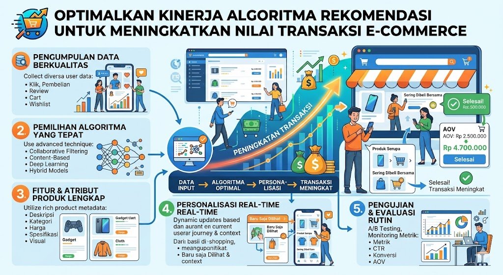 Efektivitas algoritma rekomendasi menjadi kunci utama dalam memenangkan persaingan di industri e-commerce modern. Algoritma yang cerdas tidak hanya berfungsi menampilkan produk, tetapi juga bertindak sebagai asisten belanja pribadi yang memahami kebutuhan pengguna secara mendalam. Dengan optimasi yang tepat, platform dapat menciptakan pengalaman belanja yang relevan, meningkatkan kepuasan pelanggan, dan secara otomatis mendorong pertumbuhan nilai transaksi atau Average Order Value (AOV).