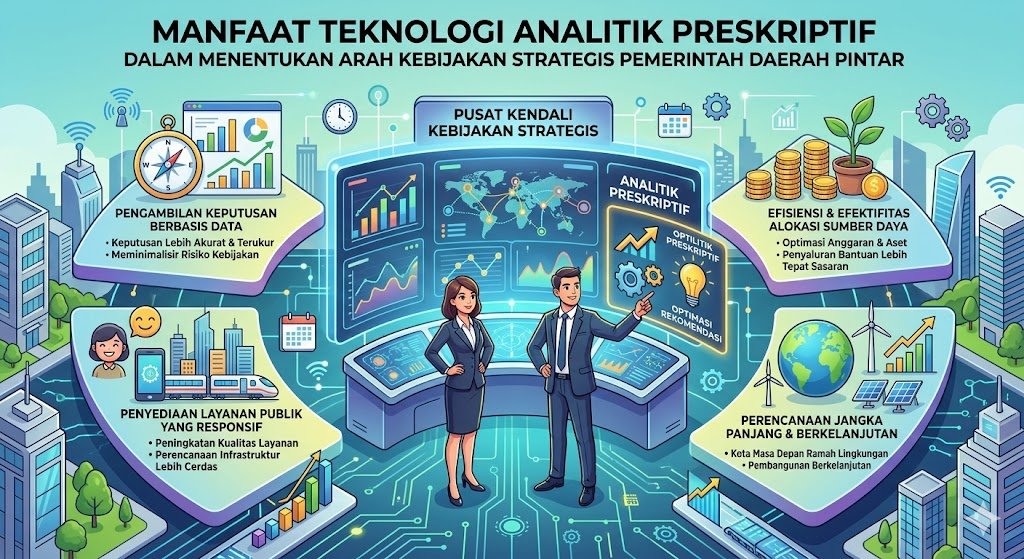 Implementasi konsep kota cerdas atau smart city kini tidak lagi hanya sebatas pada penyediaan infrastruktur digital, melainkan telah bergeser ke arah pemanfaatan data yang lebih mendalam. Salah satu instrumen paling mutakhir yang mulai diadopsi oleh pemerintah daerah adalah analitik preskriptif. Berbeda dengan analitik deskriptif yang hanya menjelaskan apa yang telah terjadi, atau analitik prediktif yang meramalkan apa yang akan terjadi, analitik preskriptif melangkah lebih jauh dengan memberikan rekomendasi tindakan konkret yang harus diambil untuk mencapai hasil optimal.