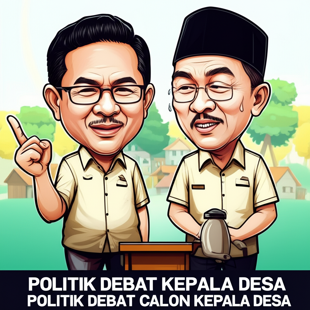 Dua sosok duduk di kursi depan, menghadap kerumunan. Pertama, Pak Karta, petahana yang dikenal bijaksana, berumur, dan tutur katanya tenang. Ia adalah sosok yang merawat tradisi, bapak yang dihormati semua. Di sebelahnya, Ibu Sari, pendatang baru yang energik, lulusan perguruan tinggi di kota, membawa angin segar modernisasi. Kontras yang mencolok, seperti padi dan drone.